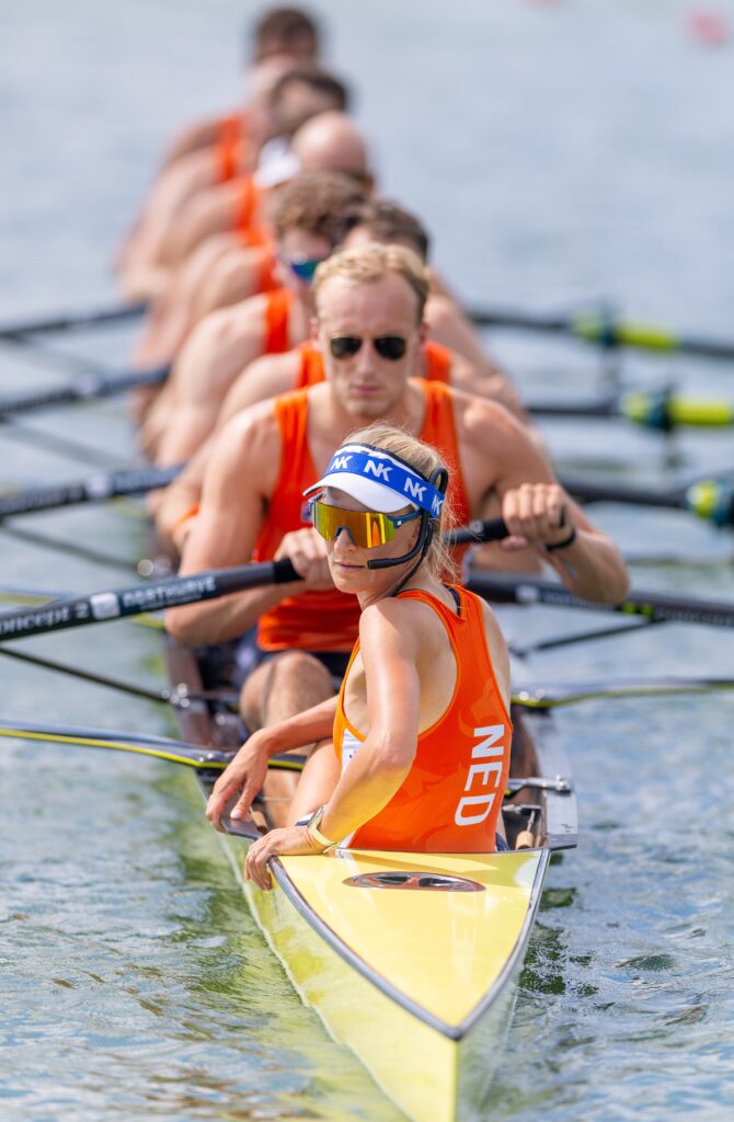 Roeifotografie is een uitdaging, vertelt fotograaf Iris van den Broek. Afgelopen zaterdag legde zij de mannen acht vast, met Jonna de Vries als stuurvrouw. ‘Bij finales moet de hele boot in beeld, wat vaak saaie, vlakke beelden oplevert. Bij een kwalificatie of kwartfinale is de finish minder belangrijk en kies je als fotograaf vaker voor de start. Daar kun je dichterbij komen en ook gezichten vastleggen.’
