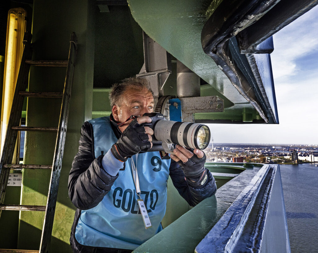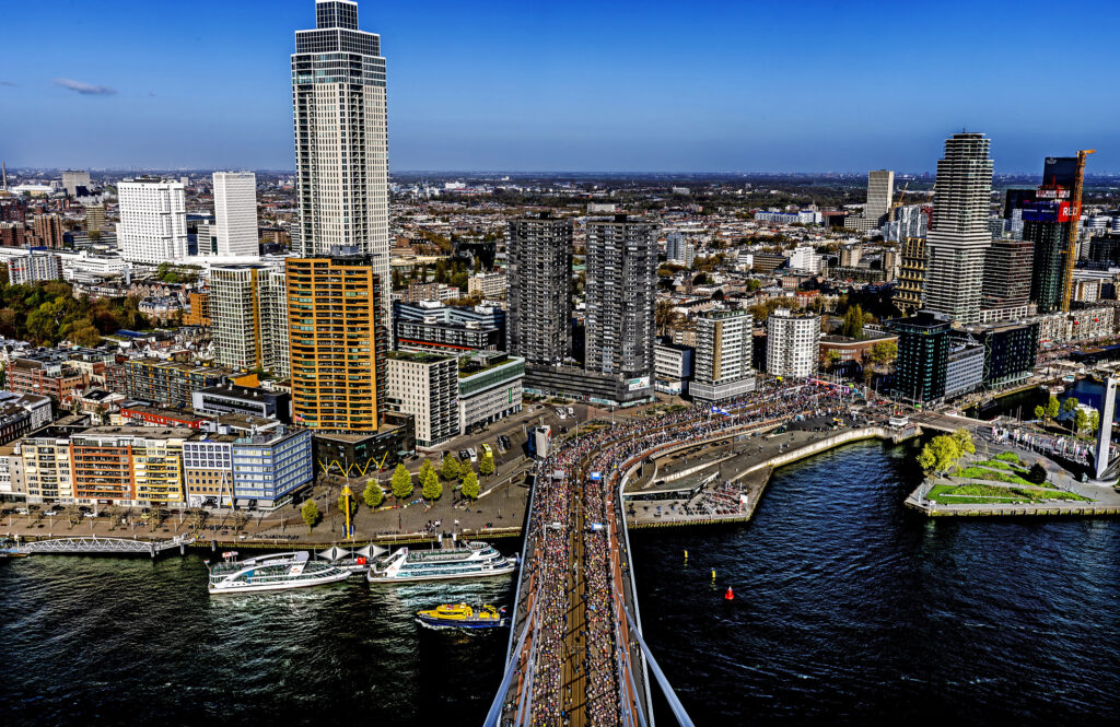 Fotograaf Pim Ras zocht voor de 45e editie van de Marathon Rotterdam bewust naar een nieuws perspectief. Na dertig jaar langs het parcours, koos hij dit keer voor het hoogste punt van de Erasmusbrug: het zogeheten hoedje. ‘Ik wilde dit keer iets anders maken, iets bijzonders’, vertelt hij. Vanaf daar maakte hij meerdere beelden, waaronder het wijde shot voor de cover van het marathonboek van het AD en een foto waar hij zelf het meest trots op is.